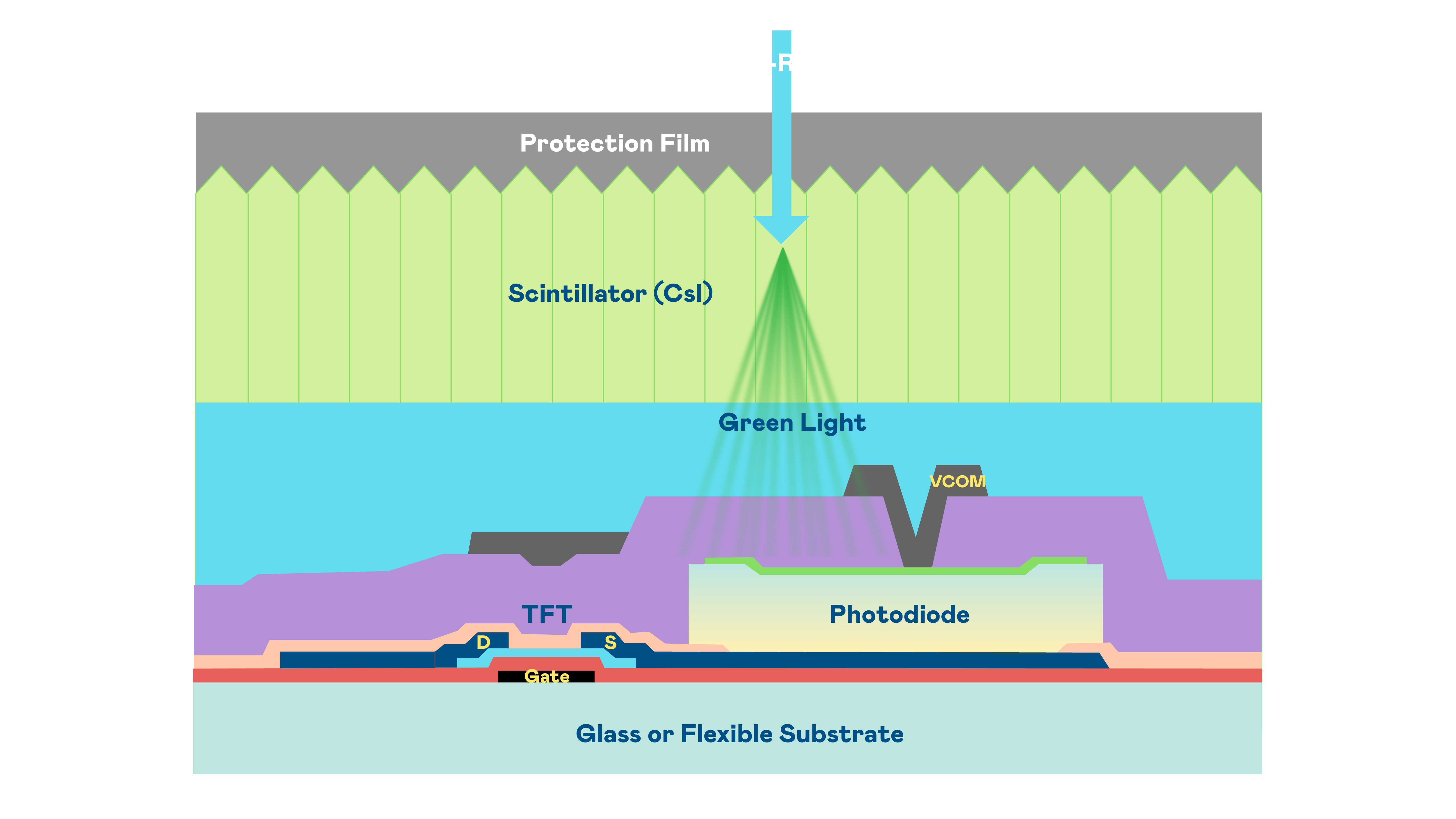 BG大游的X光影像感测阵列使用薄膜电晶体 (TFT) 作为每个像素的读取开关,搭配光电二极体(Photodiode)的光电转换元件,用以感测X光影像讯号。